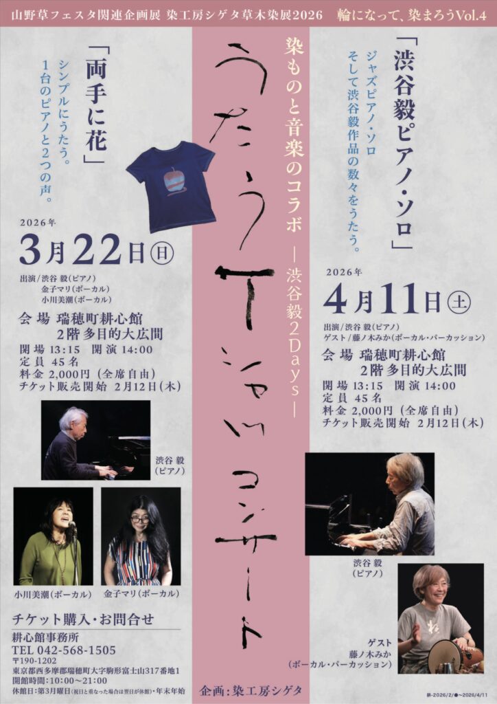 耕心館の歴史ある建物を染工房シゲタの作品が彩り、その空間に響きわたる音楽。他ではなかなか体験できない、贅沢な時間を味わいにいらしてください。